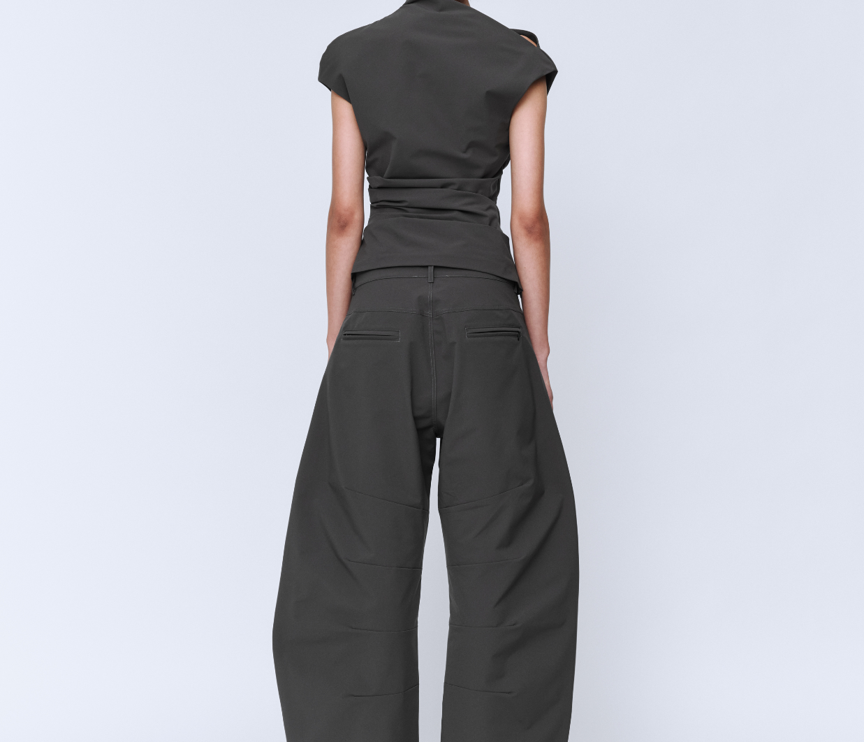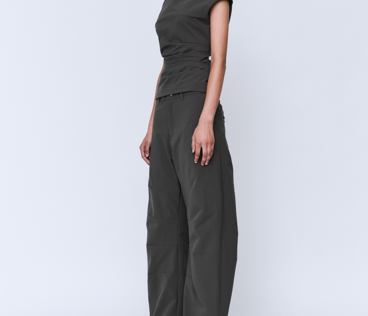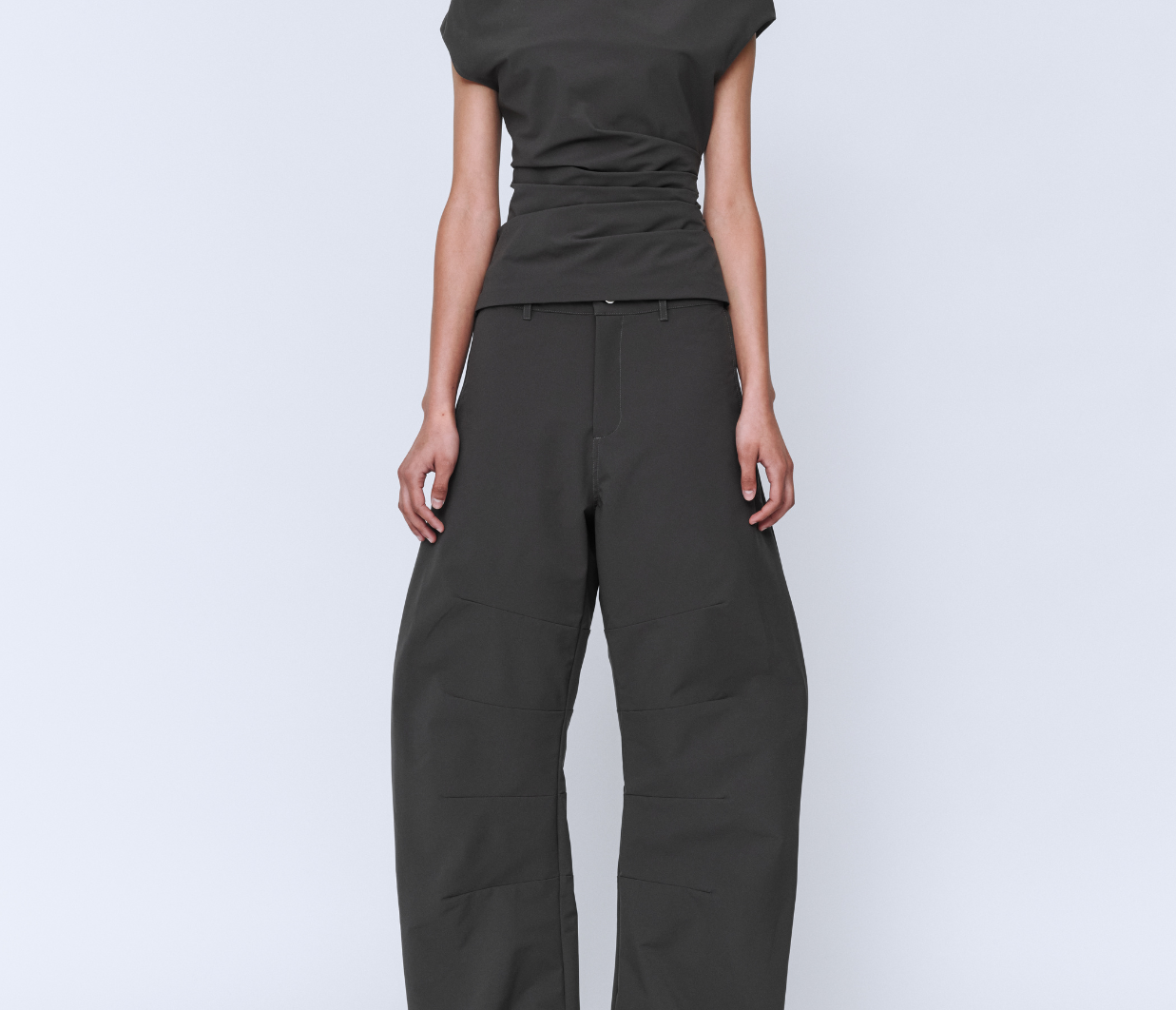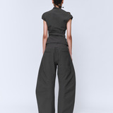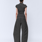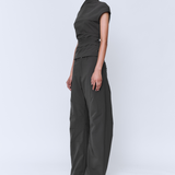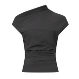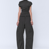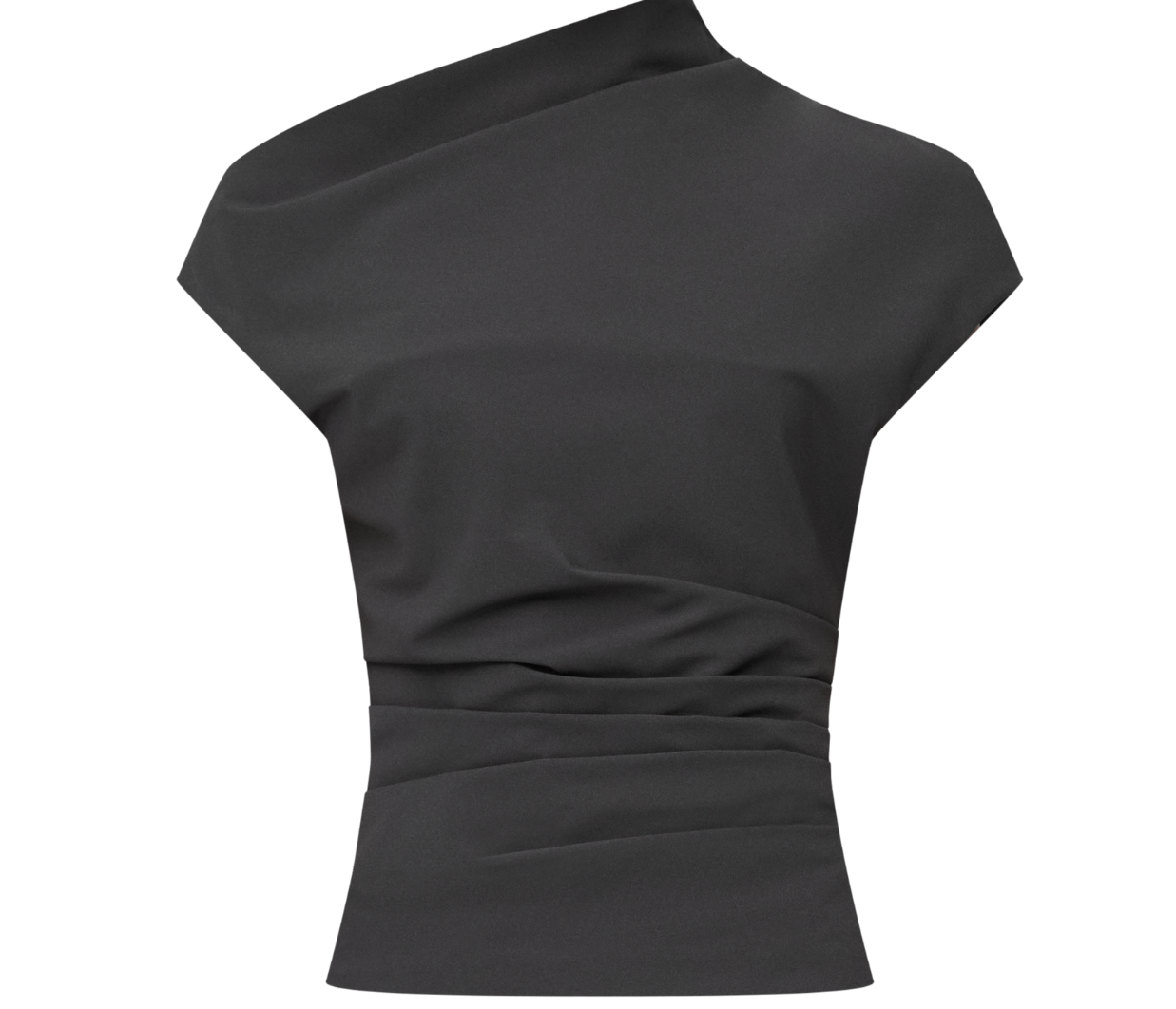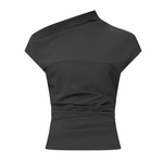 Introducing Wynn Hamlyn's Rita Top in Charcoal, an asymmetric-shoulder top in the solid black, grey hue. Designed with an asymmetric shoulder neckline, cuffed shoulder short sleeves, and ruching at the waist. Perfect top for an elevated look.