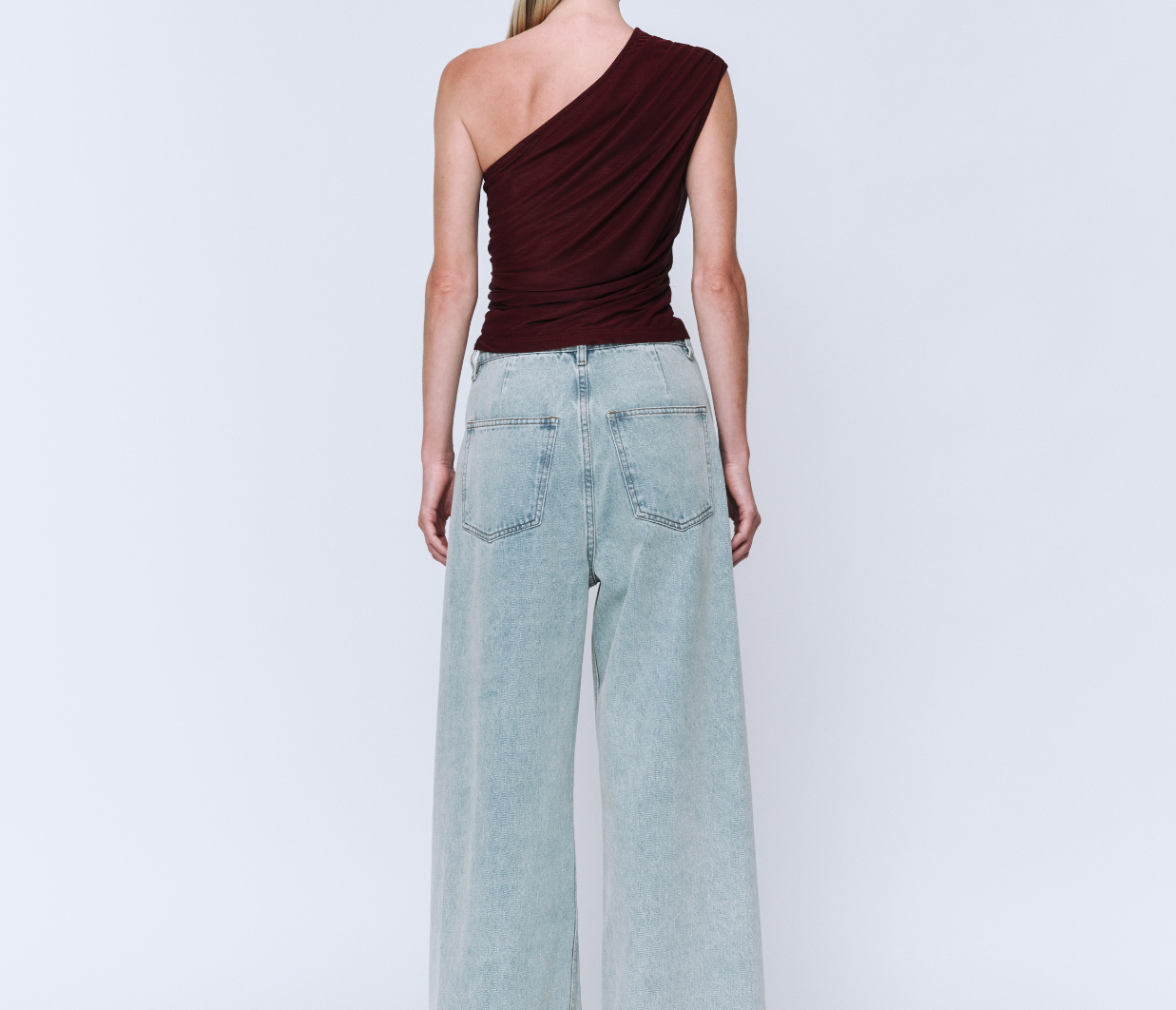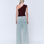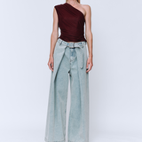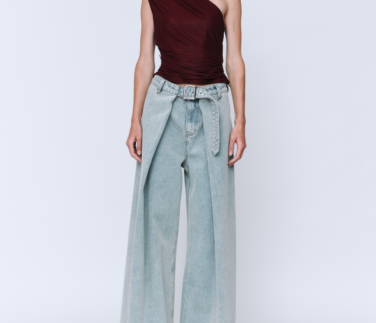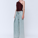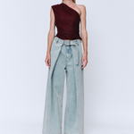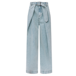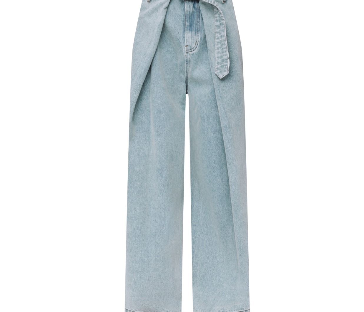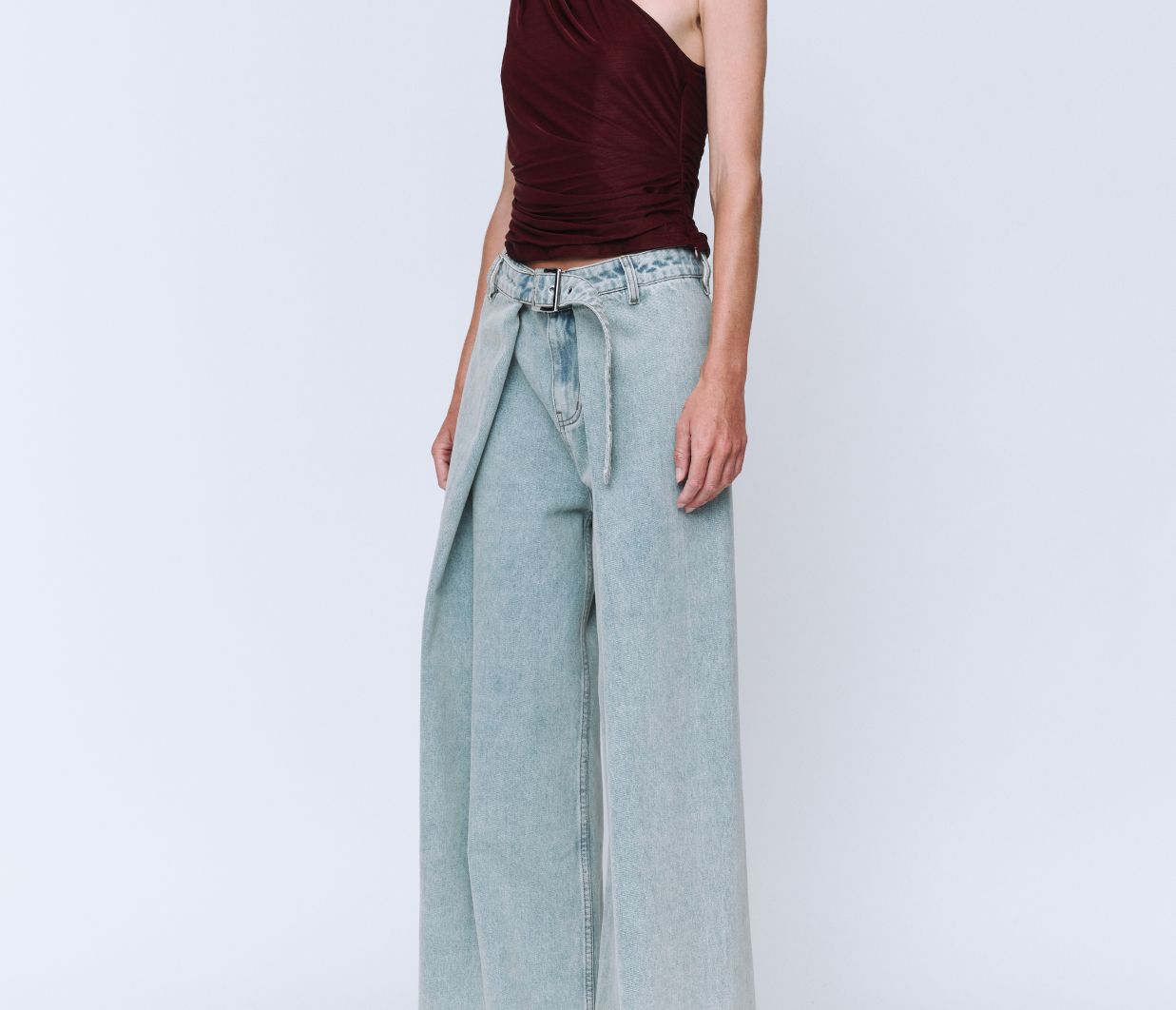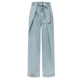 Introducing Wynn Hamlyn's Utility Wrap Jeans, a modern interpretation of classic denim bottoms. This mid-rise, wide-leg silhouette features defined press creases for structure, while the wrap-front design adds a distinctive utilitarian touch. Finished with silver hardware and an adjustable belt that can be fastened at the front or back. Jeans are made as the go-to for elevated everyday wear.
