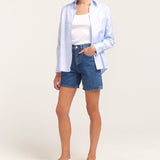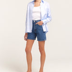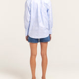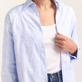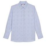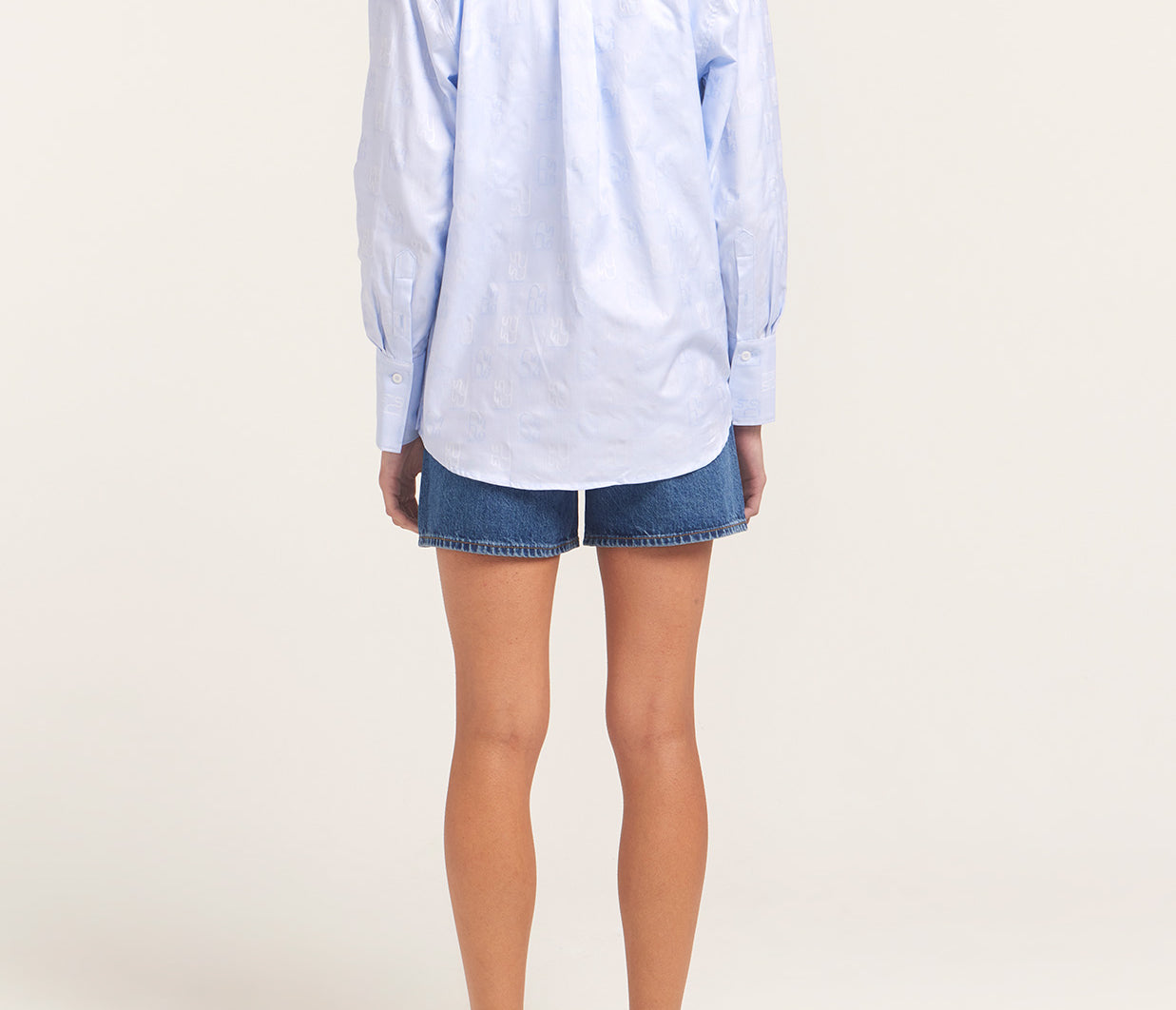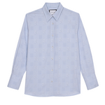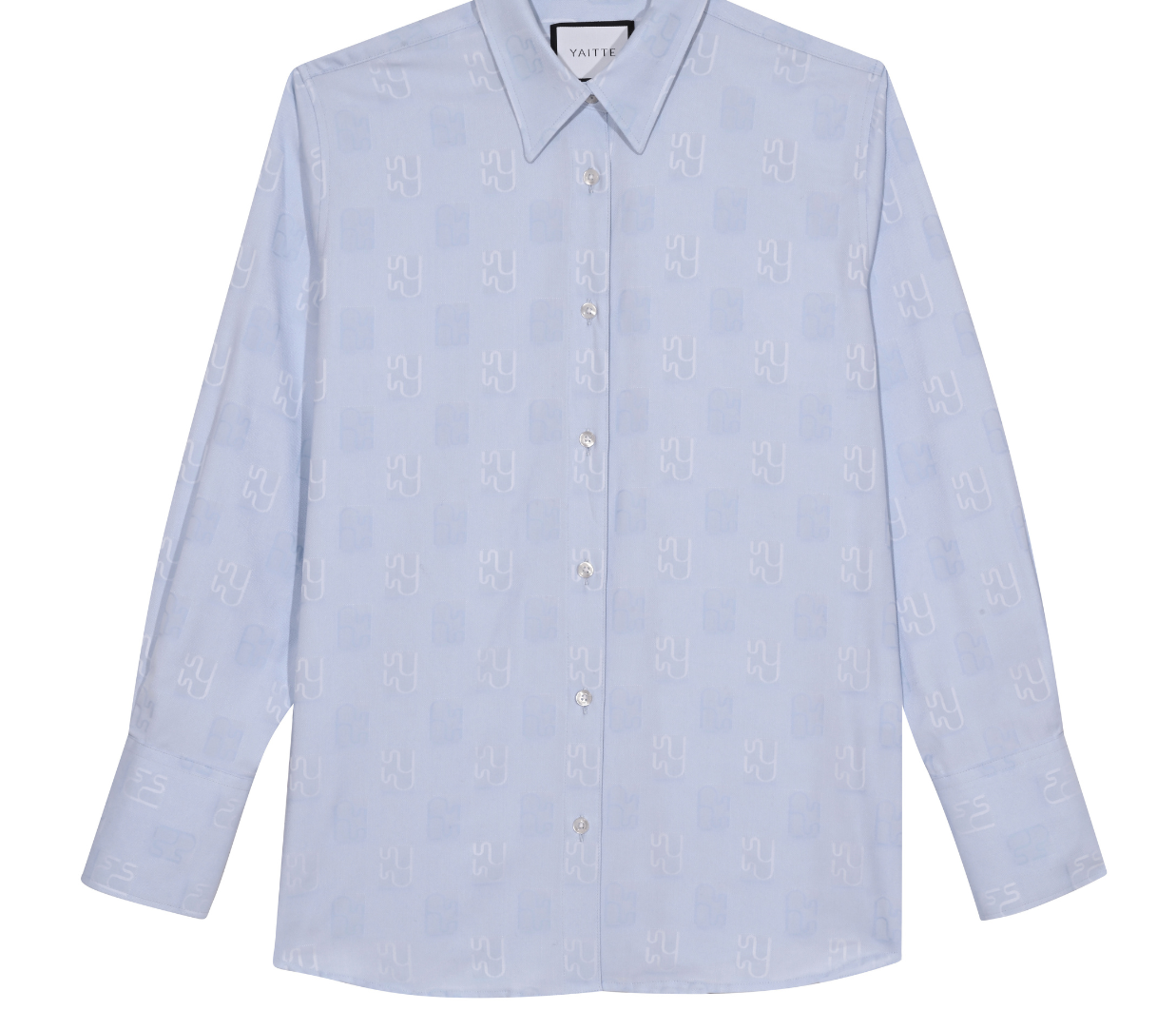 Introducing Yaitte's Buoy Shirt in Jacquard Blue is a classic collared t shirt silhoutte crafted from Yaitte's unique Y monogram jacquard cotton. It features a slightly relaxed fit, a sharp point collar, elongated cuffs, and a back box pleat for a sophisticated silhouette.