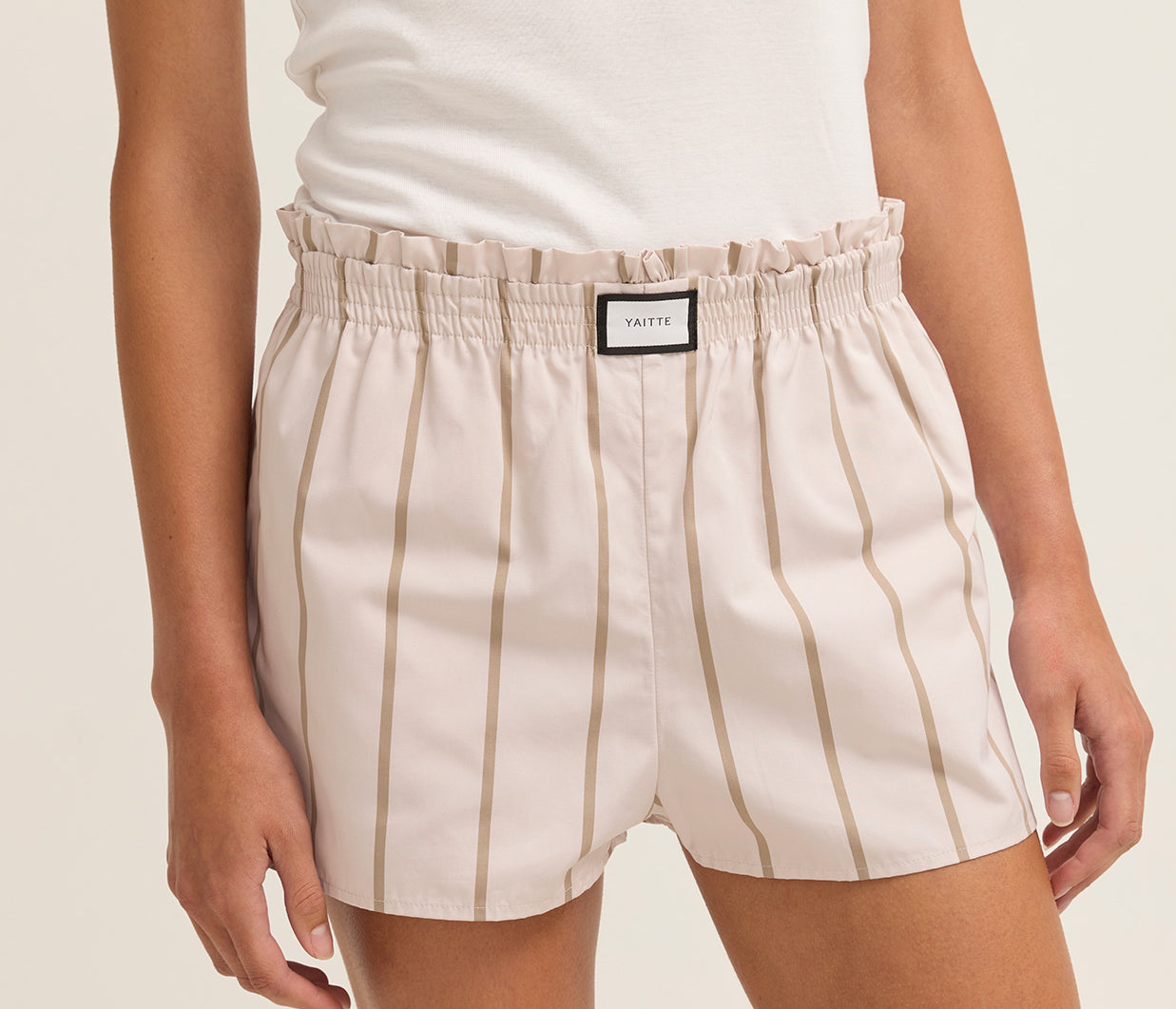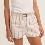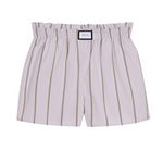 Inspired by classic boxer shorts, this Elba Short in Tofu and Sand Striped is crafted from breathable Italian crisp cotton and features a comfortable elasticated waistband. With a stylish frill top edge and handy side seam pockets, these distinct shorts are perfect for pairing with one of our PALMA shirts.